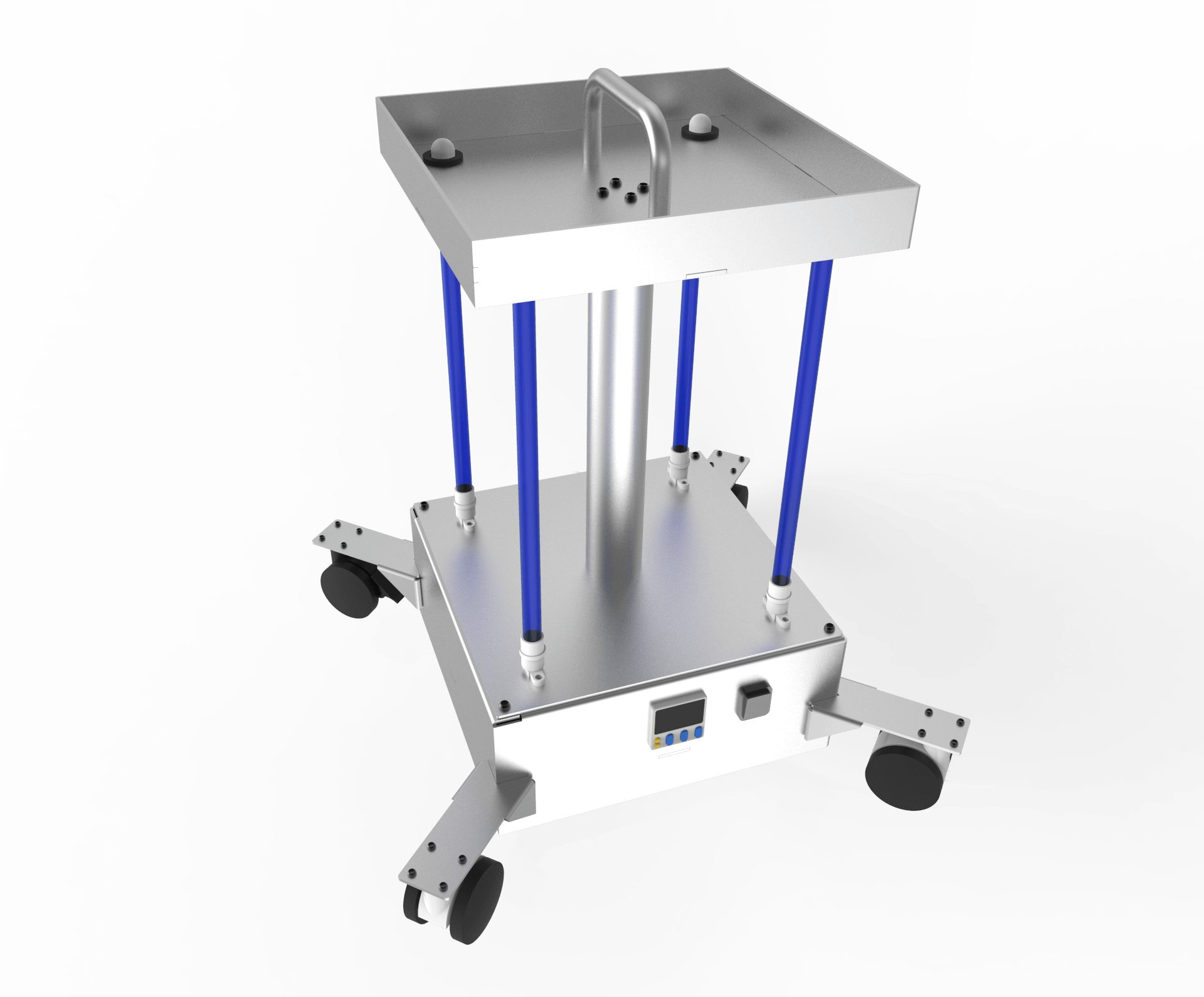 Este proiectat pentru a fi deplasat pe roti într-o cameră, după ce a fost curățata in prealabil, pentru a oferi un alt strat de sterilizare și igienizare.