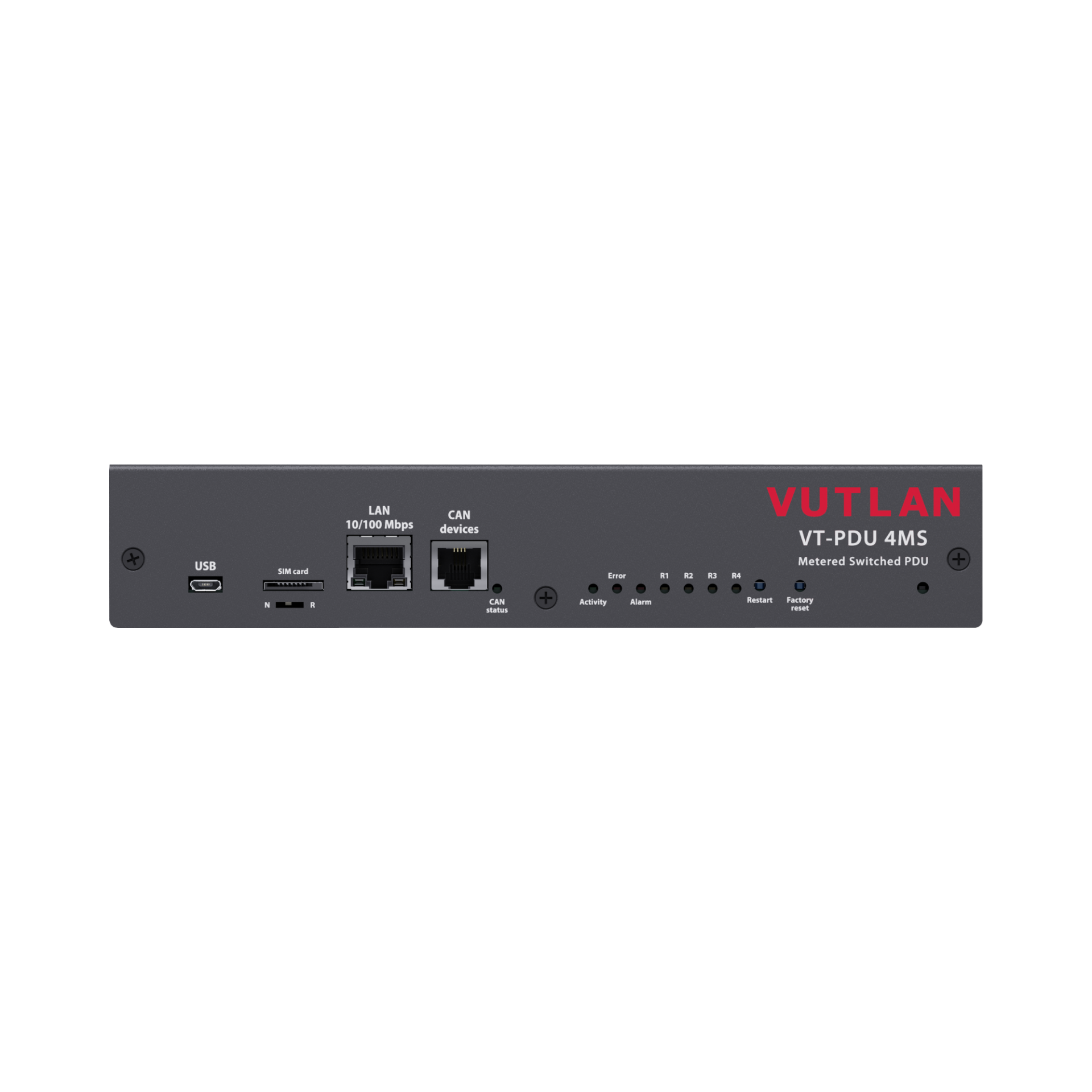 Vutlan VT-PDU 4MS / Switched PDU with 4 metered outlets is a network-controlled power distribution unit designed to monitor and control four individual outlets with high measurement accuracy and advanced management features. Power monitoring (per Outlet): Voltage (V), Current (A), Power (W), Frequency (Hz), Active power (W), Real power (W), Active energy (kWh), and Real energy (kWh) are measured with high accuracy at each outlet. Outlet Control: 4 individually switchable outlets, Rated at 10A, 230V, IEC 320 C13 Environmental Monitoring: CAN port supporting up to 24 daisy-chained CAN sensors I/O Controller: CAN input, 4 relays, SD, USB, 12v relay. Built-in Web Interface: Built-in web interface accessible via IP address Notifications: E-mail, Telegram, SNMP Trap, HTTP request, Web-to-SMS. Processor: Dual-core Cortex-A7, 720 MHz