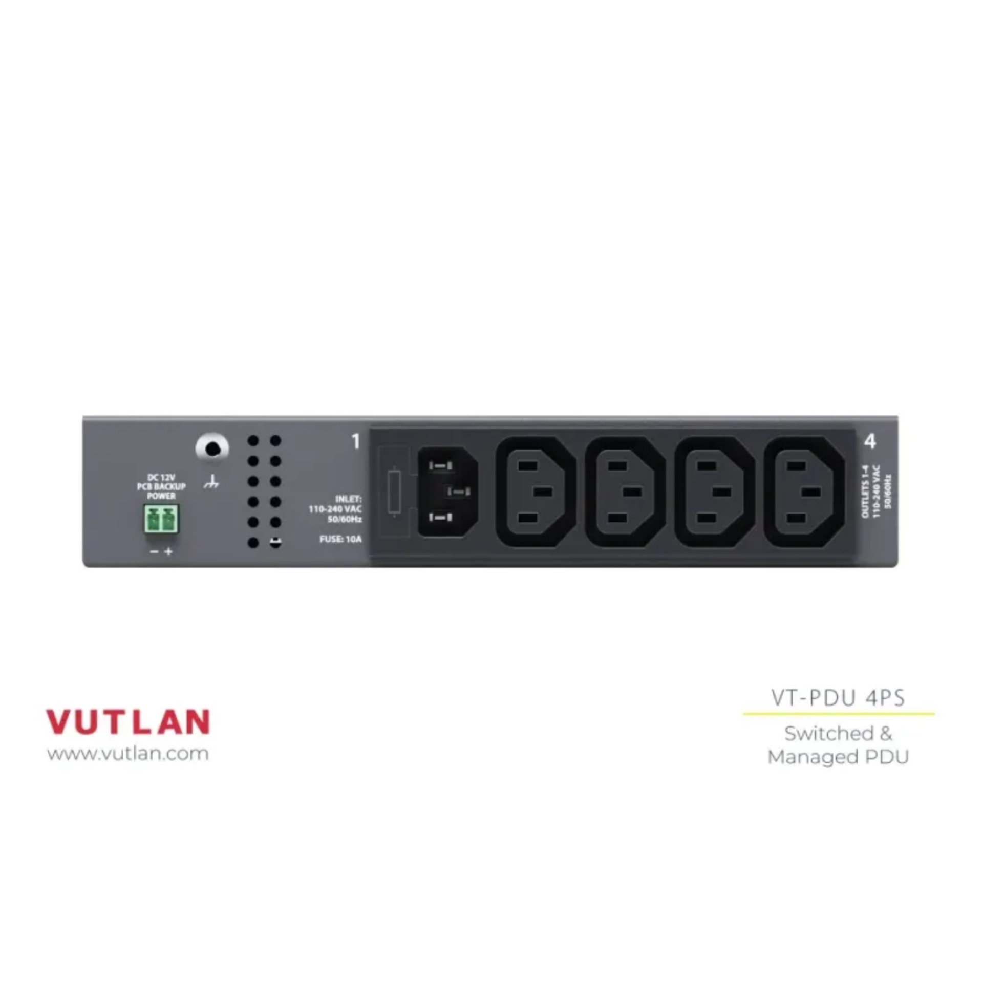 Vutlan VT-PDU 4PS / Switched PDU with 4 Outlets can be used to control four individual outlets, including: PDU switch: 4 outlets with 10A, 230V. Environmental Monitoring: Measures temperature, humidity. I/O Controller: CAN input, 4 relays, SD, USB, alarm relay. Built-in Web Interface: 100Mbit/s. Notifications: Telegram, mail. Processor: 720Mhz dual-core Cortex-A7.