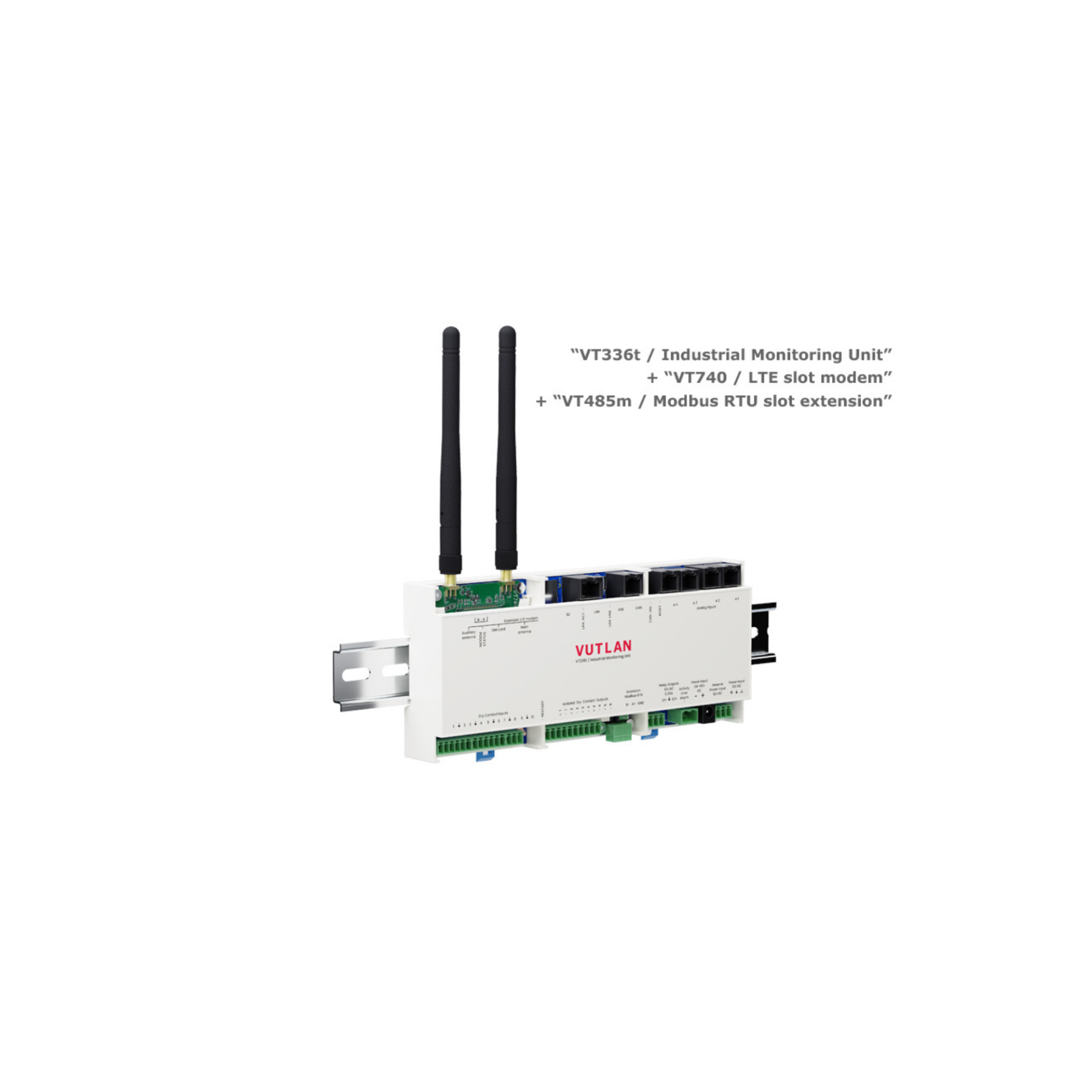 The industrial DIN monitoring and control system (I/O controller) is specially designed for DIN-rail mounting racks. Includes x6 analog sensors, CAN sensor bus, Ethernet port, RS-485 / Modbus RTU, x4 digital inputs, x2 12V DC 0.25A relays, x2 digital outputs. Supports a full range of sensors and devices. Possible extension: PoE module. Provides an Ethernet connection and PoE (Power over Ethernet). Extension "VT770 / LTE modem" (Ordered separately!) allows SMS control, Phone dial, GPS location, and Internet access. Notifications include E-mail, FTP log, Syslog, SMTP, SNMP Traps, Web-to-SMS, and PUSH. Protocols include DHCP; HTTP; HTTPS; DynDNS; SSL; SNMP v1, v2c, v3; SMTP; FTP; Syslog; RADIUS; Modbus RTU; OpenVPN. Virtual sensors include PING, timers, triggers, Logic schemes, SNMP GET, x4 IP cameras, Virtual math elements, and others.